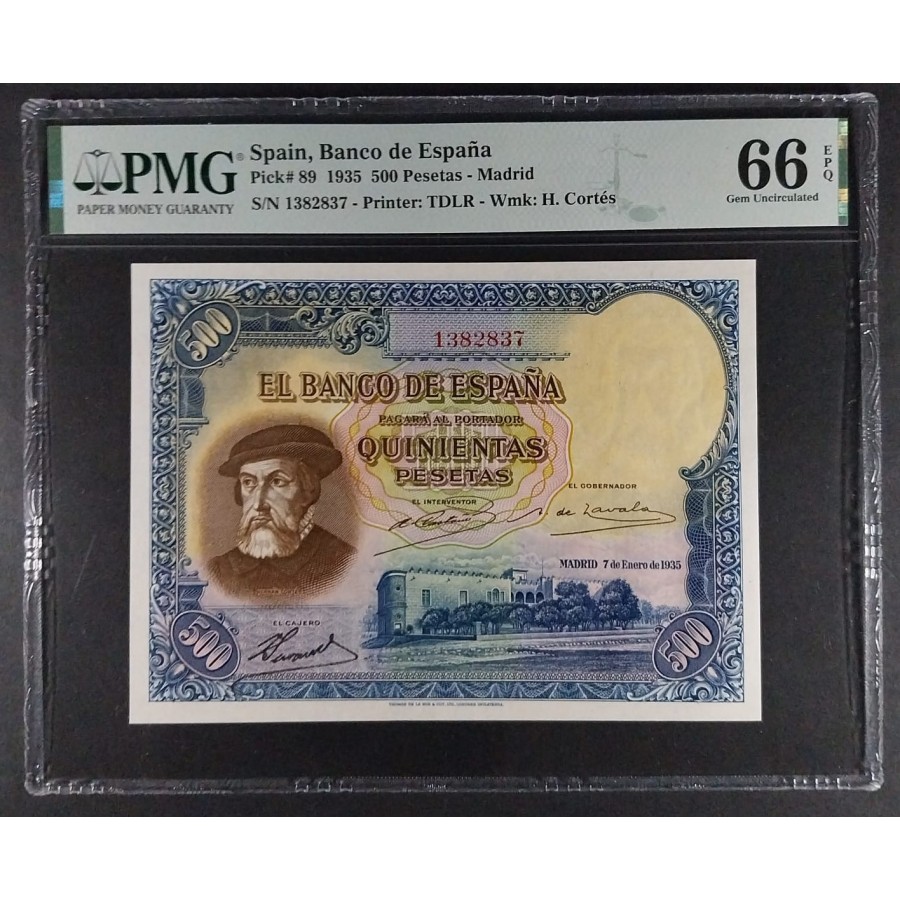 500 PESETAS 1935 HERNÁN CORTÉS PMG 66 EPQ SC