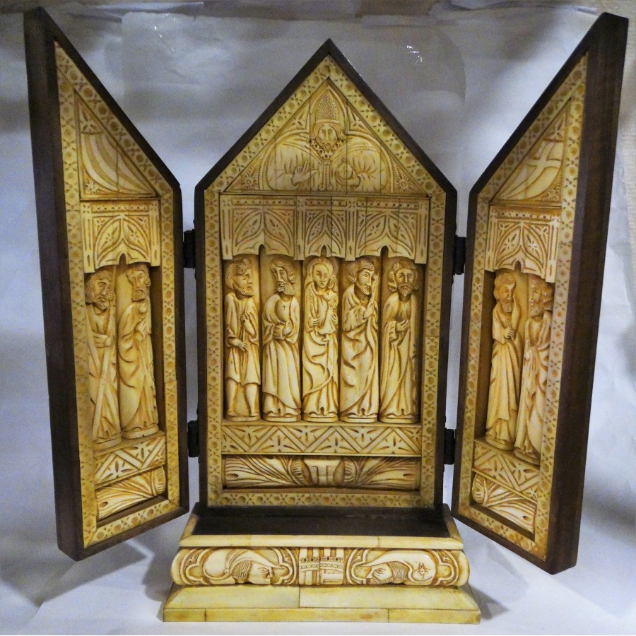 TRÍPTICO NEOGÓTICO DE HUESO Y MADERA SIGLO XIX-